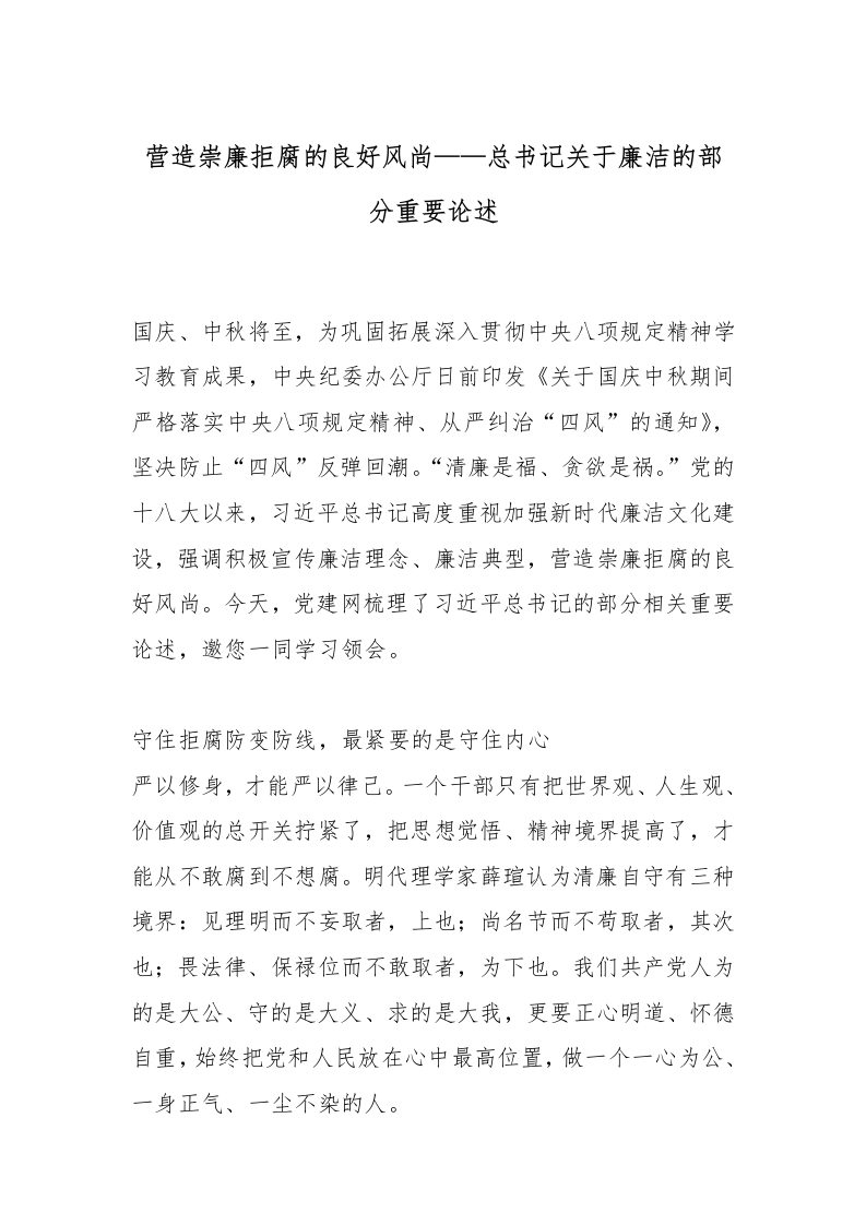 营造崇廉拒腐的良好风尚——总书记关于廉洁的部分重要论述