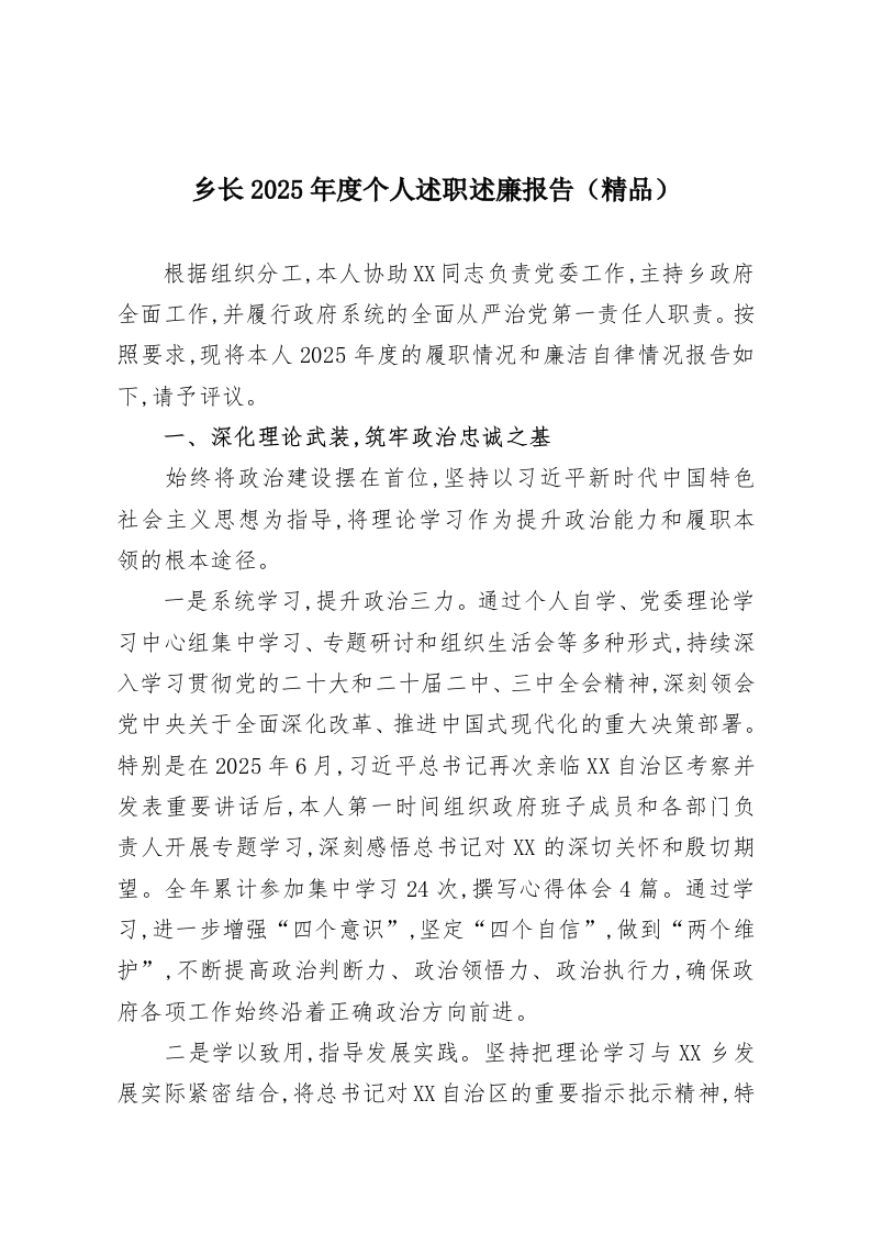 乡长2025年度个人述职述廉报告(精品)根据组织分工,本人协助XX同志负责党委工作,主持乡政府全面工作,并履行政府系统的全面从严治党第一责任人职责。按照要求,现将本人2025年度的履职情况和廉洁自律情况报告如下,请予评议。一、深化理论武装,筑牢政治忠诚之基始终将政治建设摆在首位,坚持以习近平新时代中国特色社会主义思想为指导,将理论学习作为提升政治能力和履职本领的根本途径。一是系统学习,提升政治三力。通过个人自学、党委理论学习中心组集中学习、专题研讨和组织生活会等多种形式,持续深入学习贯彻党的二十大和二十届二中、三中全会精神,深刻领会党中央关于全面深化改革、推进中国式现代化的重大决策部署。特别是在2025年6月,习近平总书记再次亲临XX自治区考察并发表重要讲话后,本人第一时间组织政府班子成员和各部门负责人开展专题学习,深刻感悟总书记对XX的深切关怀和殷切期望。全年累计参加集中学习24次,撰写心得体会4篇。通过学习,进一步增强“四个意识”,坚定“四个自信”,做到“两个维护”,不断提高政治判断力、政治领悟力、政治执行力,确保政府各项工作始终沿着正确政治方向前进。二是学以致用,指导发展实践。坚持把理论学习与XX乡发展实际紧密结合,将总书记对XX自治区的重要指示批示精神,特别是关于办好“两件大事”、建设“两个屏障”“两个基地”“一个桥头堡”的战略定位,内化为谋划工作的思路、推动发展的举措。紧密结合党纪学习教育的总体要求,将党的纪律规矩刻印于心、付诸于行,把学习成果转化为推动高质量发展的强大动力和实际成效,切实打牢了思想根基和理论基础。二、聚焦战略部署,擘画高质量发展蓝图坚决贯彻落实党中央、XX自治区、XX市及XX市的各项决策部署,牢牢把握高质量发展这一首要任务,立足XX乡资源禀赋和发展阶段,奋力谱写中国式现代化XX乡新篇章。2025年是实施“十四五”规划的收官之年,也是谋划“十五五”发展的关键之年。本人坚决维护党委的领导核心地位,严格执行重大问题向乡党委请示报告制度。在乡党委的坚强领导下,团结带领政府一班人,紧紧围绕XX市委、市政府“建设XX市高质量发展样板城市”的目标定位,以完成好习近平总书记交给X的“五大任务”和实施“六个工程”为战略导向,坚定不移地走以生态优先、绿色发展为导向的高质量发展新路子。一年来,我们锚定“生态立乡、农牧强乡、产业富乡、文旅兴乡、和谐安乡”的发展定位,积极应对宏观经济环境变化和自然灾害带来的双重挑战,在优化产业结构、推进重大项目、完善基础设施、增进民生福祉、维护社会稳定等方面主动作为,全乡经济社会发展呈现稳中有进、质效齐升的良好态幕。三、恪尽职守担当,务求履职尽责实效始终坚持以人民为中心的发展思想,聚焦主责主业,狠抓工作落实,全力推动各项任务目标圆满完成。(一)夯实农牧产业根基,筑牢粮食安全屏障坚决扛起粮食安全的政治责任,持续优化种植结构。严格遵循“稳粮、扩豆、优经、扩饲”的发展思路,全年粮食播种面积稳定在19.1万亩,其中大豆种植面积扩大至7.5万亩,玉米种植面积11万亩,青贮、杂粮等作物种植面积0.6万亩。粮食总产量和单位面积产量均实现稳步增长。成功实施大豆单产提升工程项目2000亩、绿色高产高效种植示范项目1500亩,推广应用东北黑土地保护性耕作技术13.2万亩,超额完成XX市下达的目标任务。在畜牧业发展方面,持续推广羊胚胎移植、高品质肉牛杂交改良等先进技术,推动畜牧业从数量增长型向质量效益型转变。截至年末,全乡牲畜存栏量达到15.5万头,其中XX品种牛、改良品种羊等优质畜种占比显著提升。培育和壮大家庭牧场62个,规范提升农民专业合作社25个,农牧业产业化、规模化水平进一步提高。(二)激发产业振兴活力,拓宽富民增收渠道坚持将产业振兴作为乡村全面振兴的重中之重,着力构建多元化、特色化现代乡村产业体系。全年统筹推进乡村振兴重点产业项目6个,总投资超过1000万元,为村集体经济壮大和村民稳定增收注入了强劲动力。其中,总投资2000万元的户用分布式光伏项目已在部分村屯并网发电,预计每年可为村集体带来稳定的“阳光收入”;占地1600余亩的中草药种植基地项目初见规模,带动周边百余户村民实现就地务工增收;XX村二组的