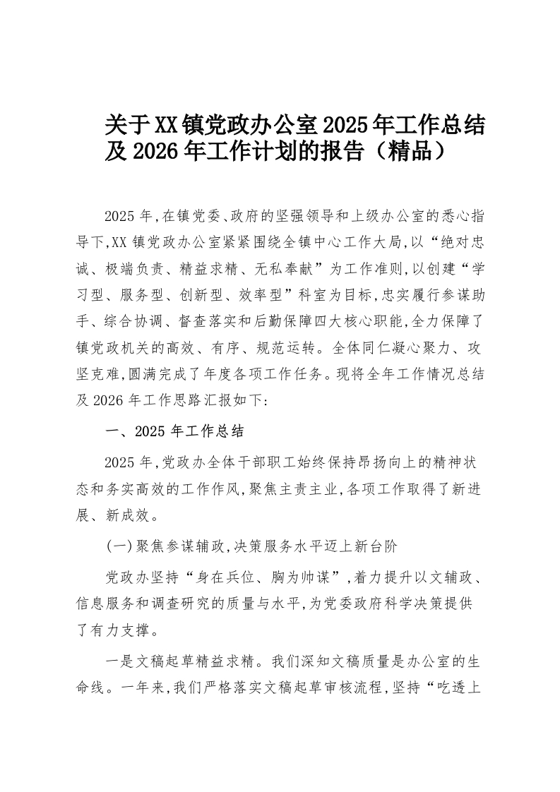 关于XX镇党政办公室2025年工作总结及2026年工作计划的报告(精品)