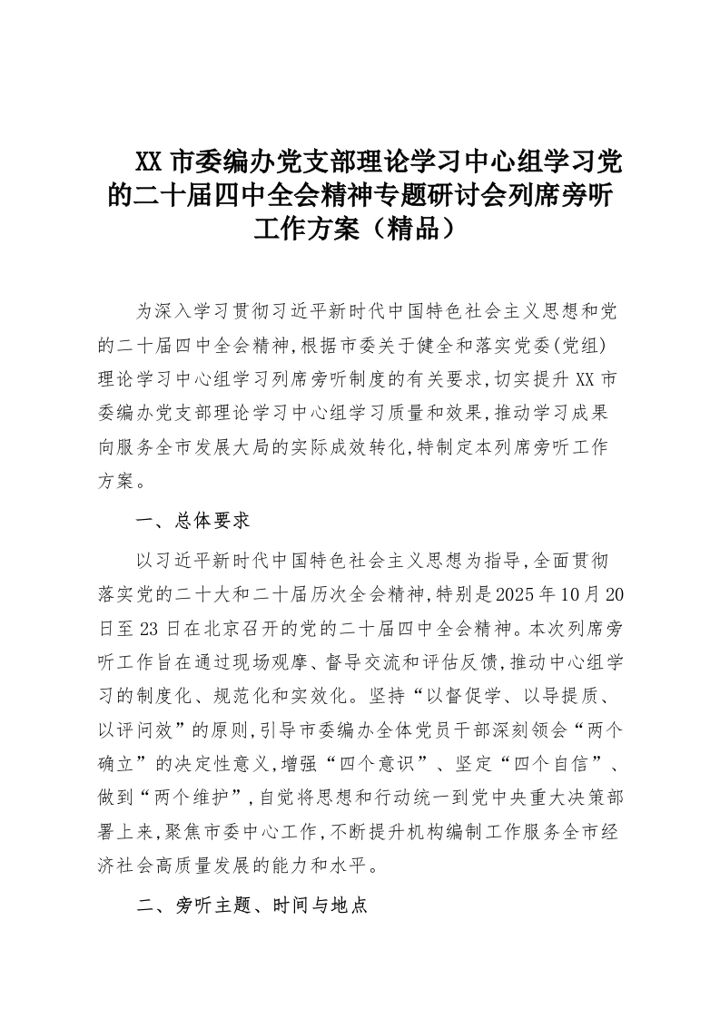 XX市委编办党支部理论学习中心组学习党的二十届四中全会精神专题研讨会列席旁听工作方案(精品)