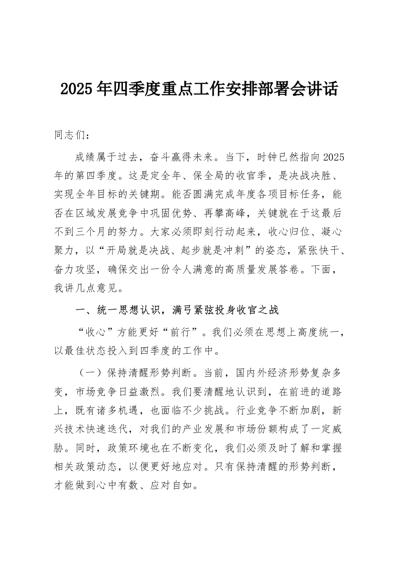 2025年四季度重点工作安排部署会讲话同志们:成绩属于过去,奋斗赢得未来。当下,时钟已然指向2025年的第四季度。这是定全年、保全局的收官季,是决战决胜、实现全年目标的关键期。能否圆满完成年度各项目标任务,能否在区域发展竞争中巩固优势、再攀高峰,关键就在于这最后不到三个月的努力。大家必须即刻行动起来,收心归位、凝心聚力,以“开局就是决战、起步就是冲刺”的姿态,紧张快干、奋力攻坚,确保交出一份令人满意的高质量发展答卷。下面,我讲几点意见。一、统一思想认识,满弓紧弦投身收官之战“收心”方能更好“前行”。我们必须在思想上高度统一,以最佳状态投入到四季度的工作中。(一)保持清醒形势判断。当前,国内外经济形势复杂多变,市场竞争日益激烈。我们要清醒地认识到,在前进的道路上,既有诸多机遇,也面临不少挑战。行业竞争不断加剧,新兴技术快速迭代,对我们的产业发展和市场份额构成了一定威胁。同时,政策环境也在不断变化,我们必须及时了解和掌握相关政策动态,以便更好地应对。只有保持清醒的形势判断,才能做到心中有数、应对自如。(二)坚定目标自信。年初,我们制定了明确的目标任务,这些目标是基于对市场形势的科学分析和自身实力的准确评估而确定的。经过前三季度的努力,我们已经取得了一定的成绩,为完成全年目标奠定了坚实基础。在四季度,我们要坚定目标自信,相信通过大家的共同努力,一定能够实现既定目标。每一项任务、每一个指标,都是我们前进的动力和方向,我们要咬定目标不放松,全力以赴抓落实。(三)保持昂扬精神状态。精神状态决定工作成效。四季度的工作任务艰巨繁重,需要我们保持昂扬的斗志和饱满的热情。要克服疲劳厌战情绪,始终保持积极向上的心态;要敢于担当、勇于负责,面对困难不退缩,面对挑战不畏惧;要发扬团结协作精神,心往一处想、劲往一处使,形成强大的工作合力。只有以昂扬的精神状态投入工作,才能在收官之战中取得优异成绩。二、精准调度经济,有力举措稳定增长大局稳增长是当前压倒一切的中心任务。第四季度是经济运行的“收官季”,也是决定全年成色的“冲刺期”。我们必须坚持问题导向、目标导向、结果导向,加强经济运行监测调度,找准症结、精准发力,确保经济运行在合理区间,为发展大局贡献更多增量。(一)强化监测分析,做到心中有数。要建立健全经济运行监测体系,密切关注重点行业、重点企业、重点指标的运行情况。加强对经济数据的分析研究,及时掌握经济运行的动态变化,准确判断经济形势。通过深入分析,找出经济运行中存在的问题和潜在风险,为制定针对性的政策措施提供依据。要加强与统计、发改、工信等部门的沟通协作,实现信息共享、数据互通,确保监测分析的准确性和及时性。(二)强化政策供给,做到手中有策。针对经济运行中存在的问题,要及时出台相关政策措施,精准发力、靶向施策。要加大对实体经济的支持力度,落实好各项减税降费政策,降低企业成本,激发企业活力。要加强对重点项目的扶持,加大资金投入,保障项目顺利推进。要积极推动产业升级转型,培育新的经济增长点。同时,要加强政策宣传解读,确保政策落地见效,让企业和群众真正享受到政策红利。(三)强化责任落实,做到肩上有责。经济运行监测调度工作涉及多个部门和单位,必须明确责任分工,加强协调配合。各部门要按照职责分工,切实履行好自己的职责,加强对本行业、本领域经济运行的监测分析和政策落实。要建立健全工作责任制,将任务分解到具体部门、具体人员,确保各项工作有人抓、有人管。要加强对工作落实情况的监督检查,对工作不力、责任不落实的要严肃问责。三、加快项目投资,攻坚克难筑牢发展根基项目投资是经济发展的重要支撑。四季度,我们要以攻坚克难的劲头,加快项目建设进度,筑牢发展根基。