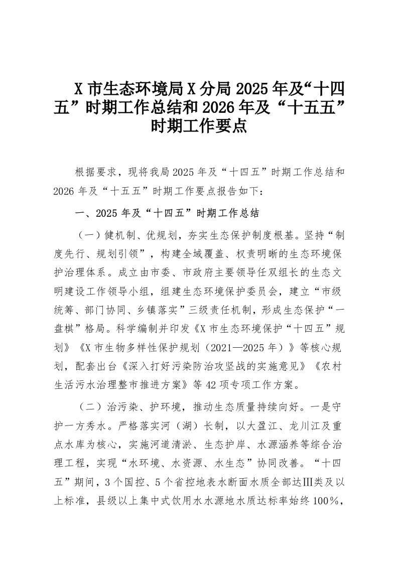 X市生态环境局X分局2025年及“十四五”时期工作总结和2026年及“十五五”时期工作要点根据要求,现将我局2025年及“十四五”时期工作总结和2026年及“十五五”时期工作要点报告如下:一、2025年及“十四五”时期工作总结(一)健机制、优规划,夯实生态保护制度根基。坚持“制度先行、规划引领”,构建全域覆盖、权责明晰的生态环境保护治理体系。成立由市委、市政府主要领导任双组长的生态文明建设工作领导小组,组建生态环境保护委员会,建立“市级统筹、部门协同、乡镇落实”三级责任机制,形成生态保护“一盘棋”格局。科学编制并印发《X市生态环境保护“十四五”规划》《X市生物多样性保护规划(2021一2025年)》等核心规划,配套出台《深入打好污染防治攻坚战的实施意见》《农村生活污水治理整市推进方案》等42项专项工作方案。(二)治污染、护环境,推动生态质量持续向好。一是守护一方秀水。严格落实河(湖)长制,以大盈江、龙川江及重点水库为核心,实施河道清淤、生态护岸、水源涵养等综合治理工程,实现“水环境、水资源、水生态”协同改善。“十四五”期间,3个国控、5个省控地表水断面水质全部达Ⅲ类及以上标准,县级以上集中式饮用水水源地水质达标率始终100%,群众饮水安全得到绝对保障。二是守护一片蓝天。坚决淘汰落后产能,“清单式”关停拆除无环保措施的小砖瓦窑厂123座;强化扬尘精细化管控,对全市建筑工地开展“拉网式”检查350个次,督促落实“六个百分百”防尘措施:加强移动源监管,完成非道路移动机械编码登记452台,构建区域空气质量联防联控机制。“十四五”期间,中心城区环境空气质量优良率分别达99.7%、100%、98.3%、100%、99.7%,昼夜噪声达标率保持100%,群众“蓝天幸福感”持续提升。三是守护一方净土。推进农村生活污水治理整市推进项目,治理率从68.4%提升至85.44%,完善农村垃圾“户分类、村收集、镇转运、市处理”体系;强化土壤污染风险管控,完成18个涉重金属废渣堆存点排查整治,严格危险废物全过程监管;推动规模化养殖场配套粪污处理设施,有效控制农业面源污染。X省县域生态环境质量监测评价与考核结果实现“从轻微变差到持续稳定、逐步向好”的转变,2021年为“轻微变差”,2022年“保持稳定”,2023年“轻微变好”,2024年“保持稳定”,生态环境质量基本面持续巩固。(三)深改革、求突破,提升治理现代化水平。深入贯彻中央和省委全面深化改革部署,将生态文明体制改革纳入全市重点改革任务清单,明确责任分工、时间节点与成果要求。“十四五”期间承担生态文明体制改革任务6项(“制定改革方案类”4项、“推动举措落实类”2项),截至2025年底,针对X市级未出台政策的3项改革任务,X市已率先开展调研与方案起草,其余3项按要求推进,改革红利逐步释放。(四)抓修复、树品牌,筑牢高黎贡山生态屏障。以高黎贡山生物生态安全保护为核心,统筹生态修复与品牌打造。配合中国环境科学研究院、中科院地理资源所开展专题调研,协助制作生态保护宣传片、整理典型案例,推动X入选联合国环境规划署“生物多样性保护与可持续发展”首个中国区域案例,成果在C0P15大会展示并向世界推广“X经验”。制定《X市高黎贡山生物生态安全风险防范和保护反馈问题整改方案》,27个反馈问题全部整改完成;2024年11月完成《X市人民政府关于高黎贡山地区“贴边开发、贴线开发”调查评估报告》,为科学保护与合理开发提供决策依据。(五)强监管、优服务,实现执法与服务双赋能。运用“双随机、一公开”监管模式,结合日常巡查与专项检查,“十四五”期间累计出动监察人员1480余人次,立案查处环境违法案件80件,处罚金额910余万元;畅通投诉渠道,办结群众环境诉求763件,维护群众环境权益。落实“一线工作法”,成立“企业服务团”,帮扶企业130余家次;高效办理环评审批,完成环境影响登记表备案643个、环评文件审批127个,审核确定212个项目环评执行标准。累计获取监测数据9.3万个,编制监测报告254份,及时发布环境质量公报,为污染防治与决策部署提供科学支撑。