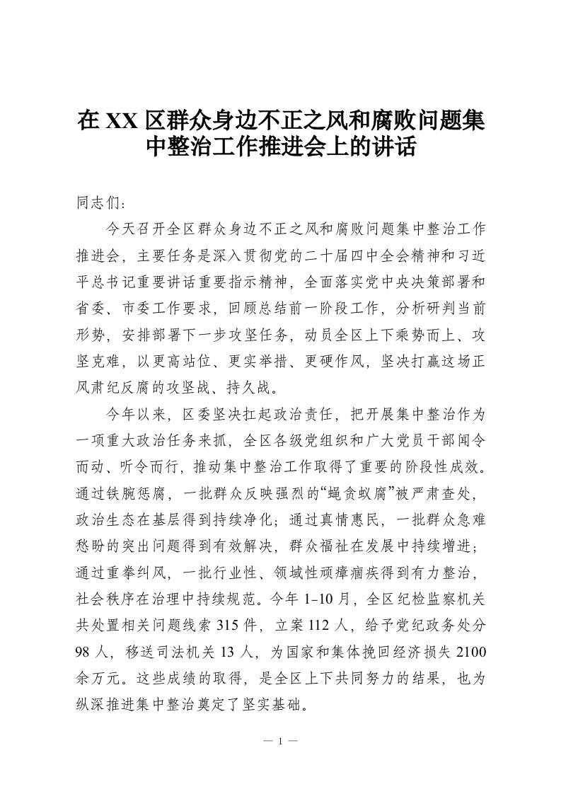 在XX区群众身边不正之风和腐败问题集中整治工作推进会上的讲话