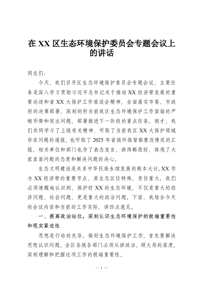 在XX区生态环境保护委员会专题会议上的讲话