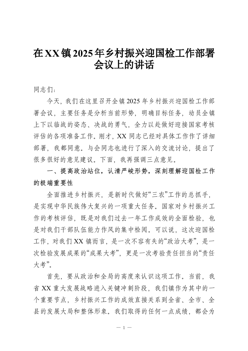 在XX镇2025年乡村振兴迎国检工作部署会议上的讲话
