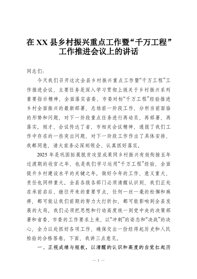 在XX县乡村振兴重点工作暨“千万工程”工作推进会议上的讲话