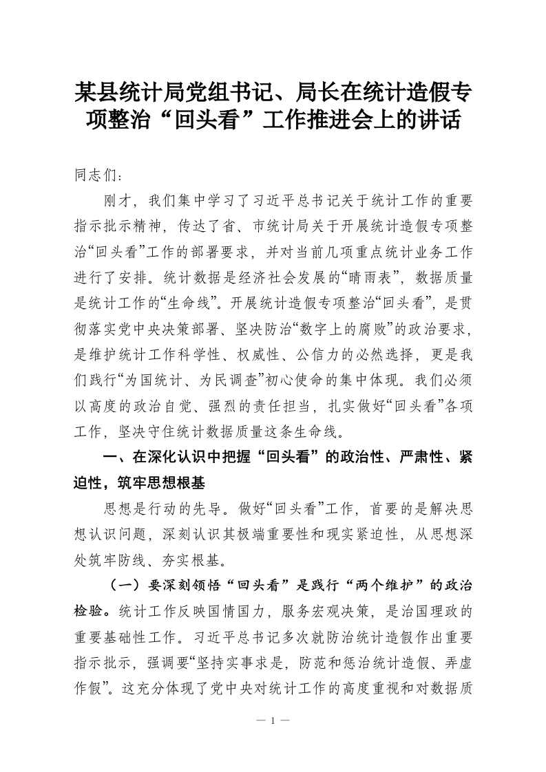 某县统计局党组书记、局长在统计造假专项整治“回头看”工作推进会上的讲话