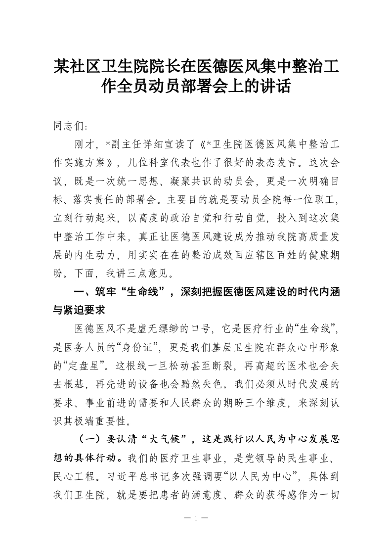 某社区卫生院院长在医德医风集中整治工作全员动员部署会上的讲话