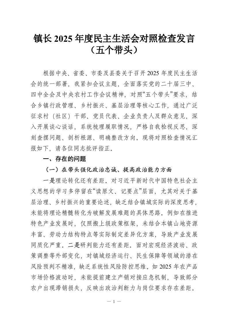 镇长2025年度民主生活会对照检查发言(五个带头)