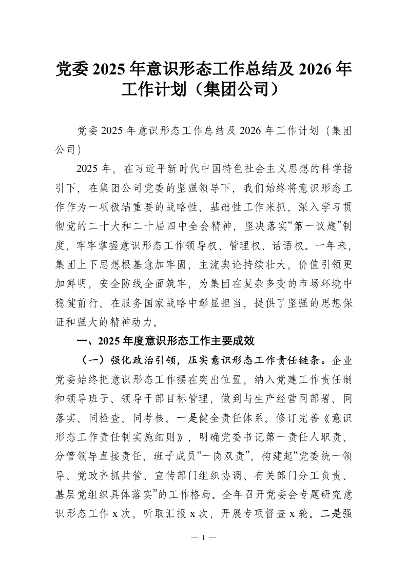 党委2025年意识形态工作总结及2026年工作计划(集团公司)