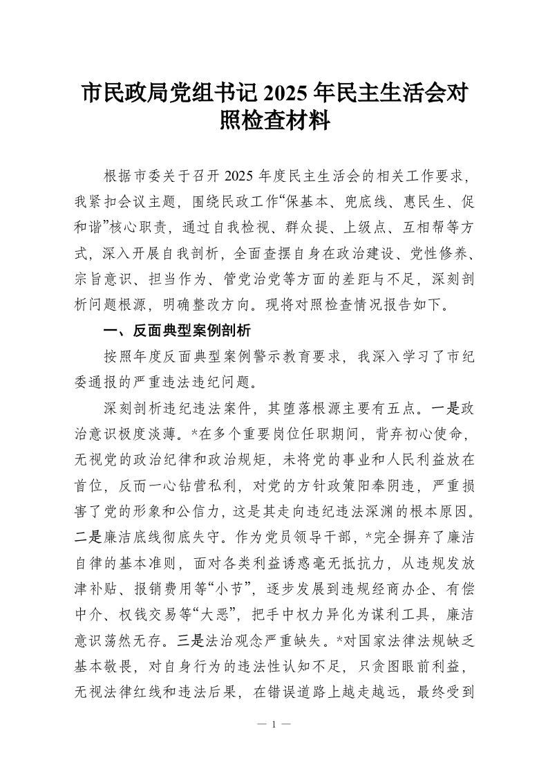 市民政局党组书记2025年民主生活会对照检查材料
