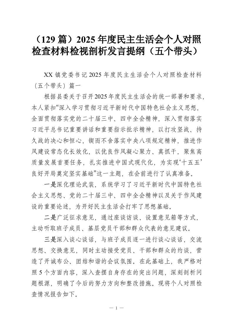 (129篇)2025年度民主生活会个人对照检查材料检视剖析发言提纲(五个带头)