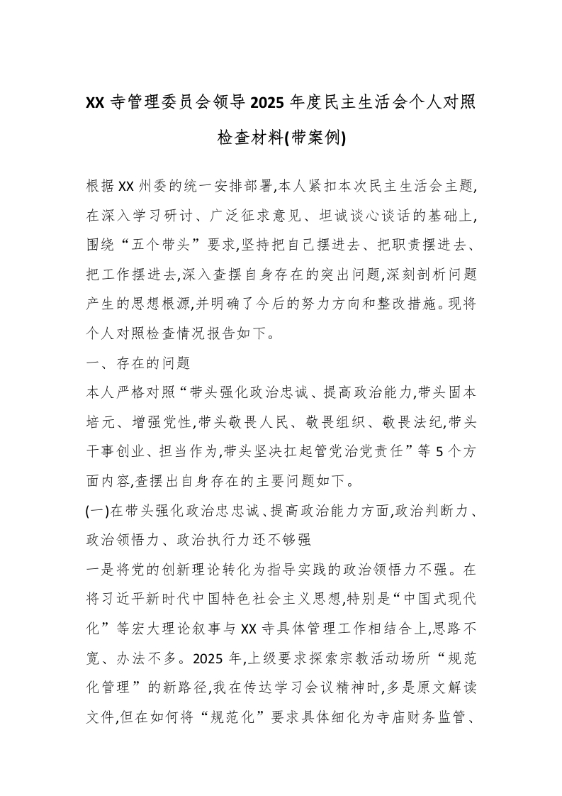 XX寺管理委员会领导2025年度民主生活会个人对照检查材料(带案例)
