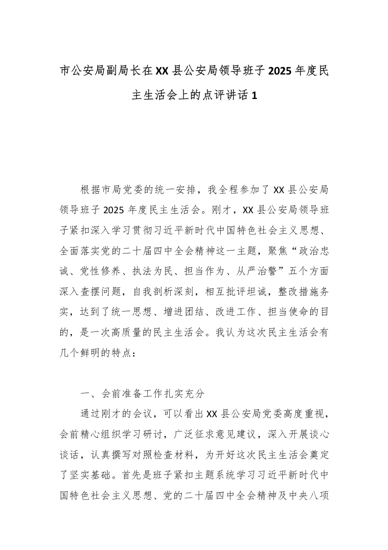 市公安局副局长在XX县公安局领导班子2025年度民主生活会上的点评讲话1