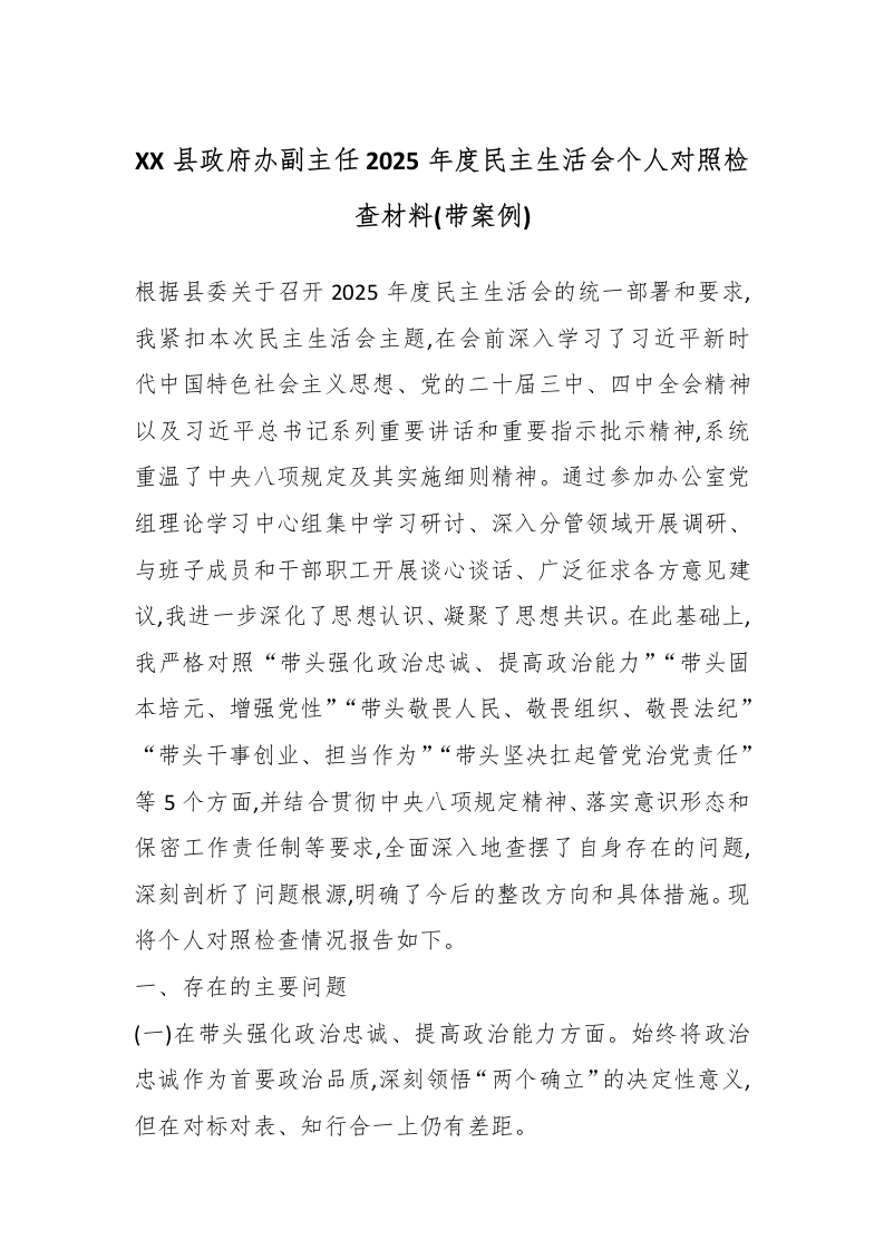 XX县政府办副主任2025年度民主生活会个人对照检查材料(带案例)