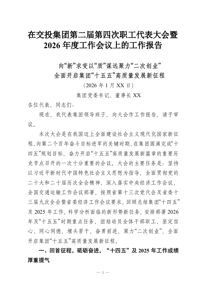 在交投集团第二届第四次职工代表大会暨2026年度工作会议上的工作报告