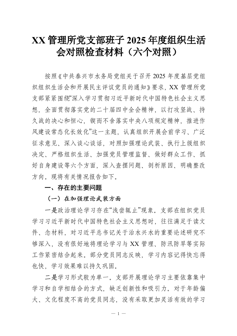 XX管理所党支部班子2025年度组织生活会对照检查材料(六个对照)