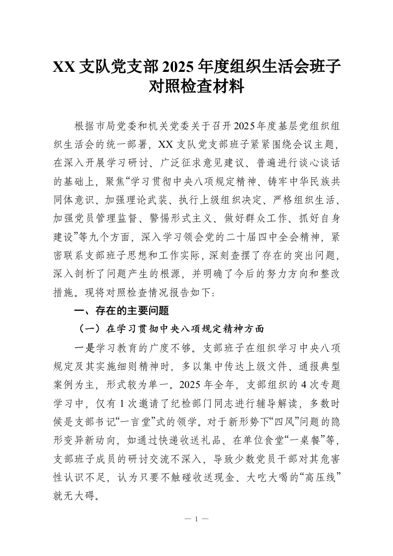XX支队党支部2025年度组织生活会班子对照检查材料