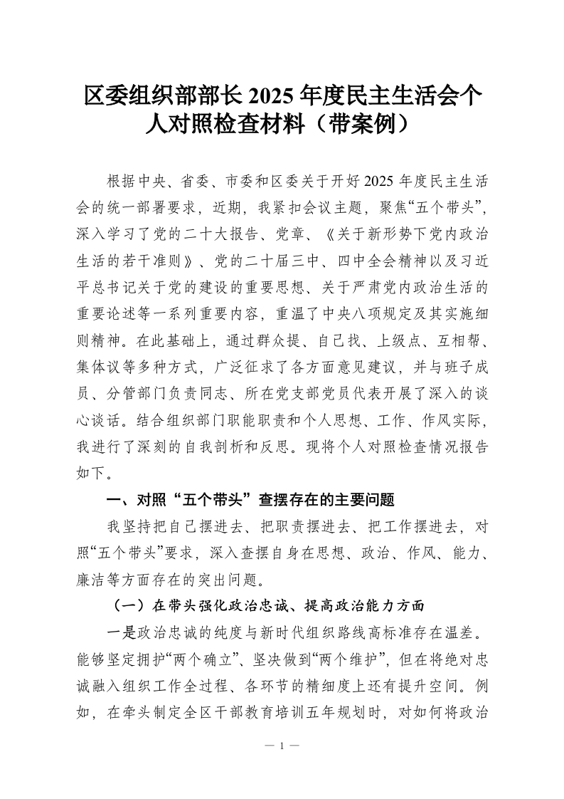 首页百家争鸣组织区委组织部部长2025年度民主生活会个人对照检查材料(带案例)