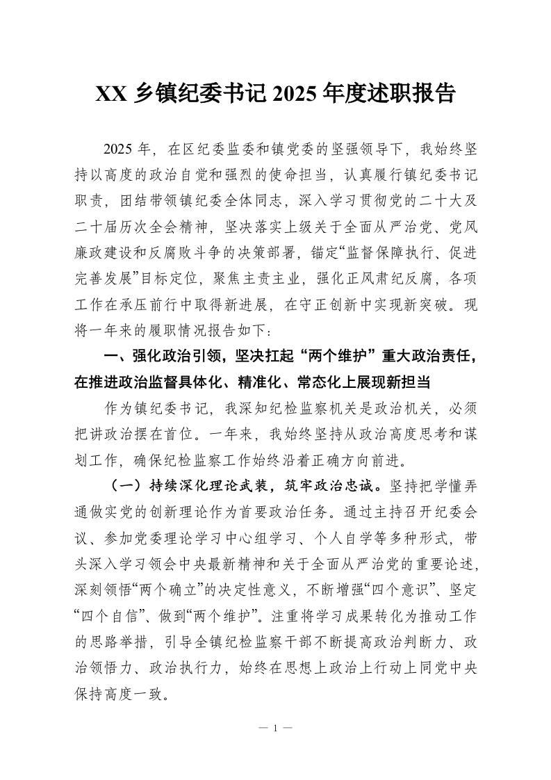 XX乡镇纪委书记2025年度述职报告