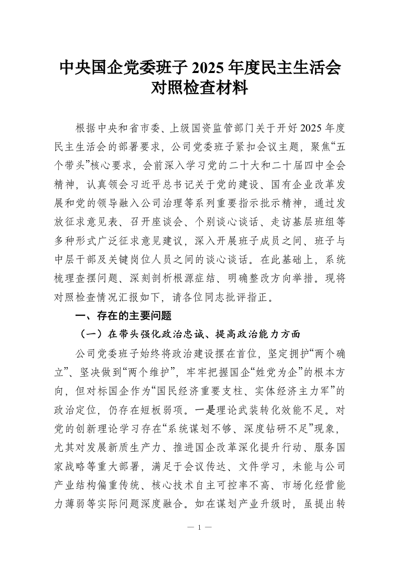 首页百家争鸣企业中央国企党委班子2025年度民主生活会对照检查材料