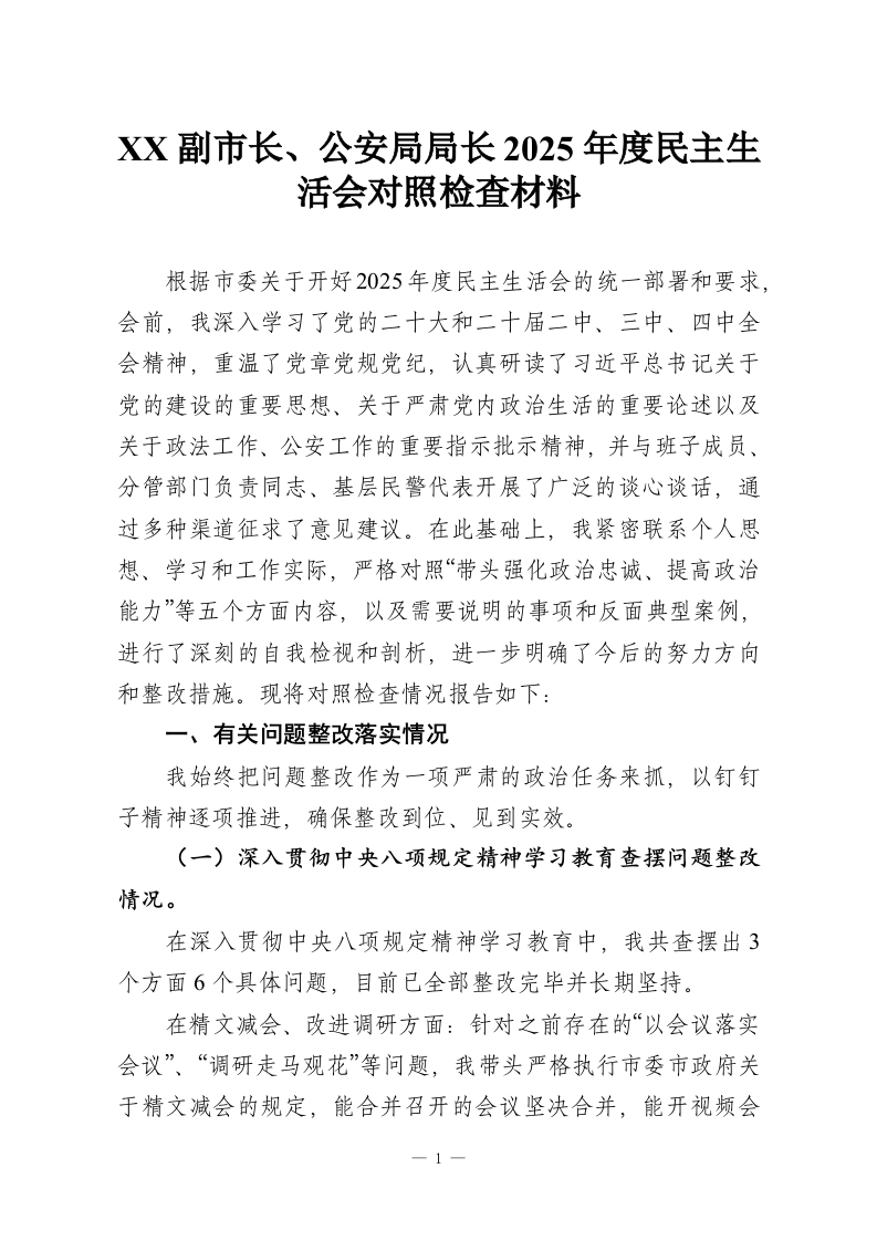 XX副市长、公安局局长2025年度民主生活会对照检查材料
