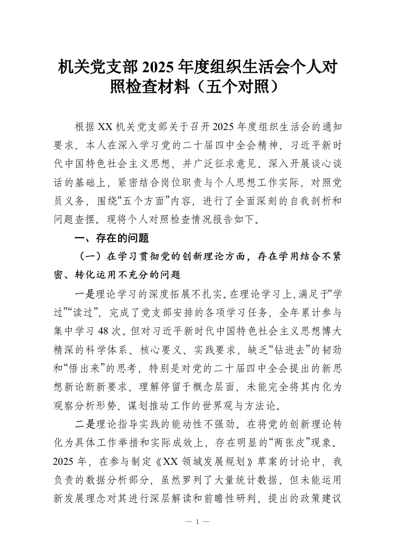 机关党支部2025年度组织生活会个人对照检查材料(五个对照)