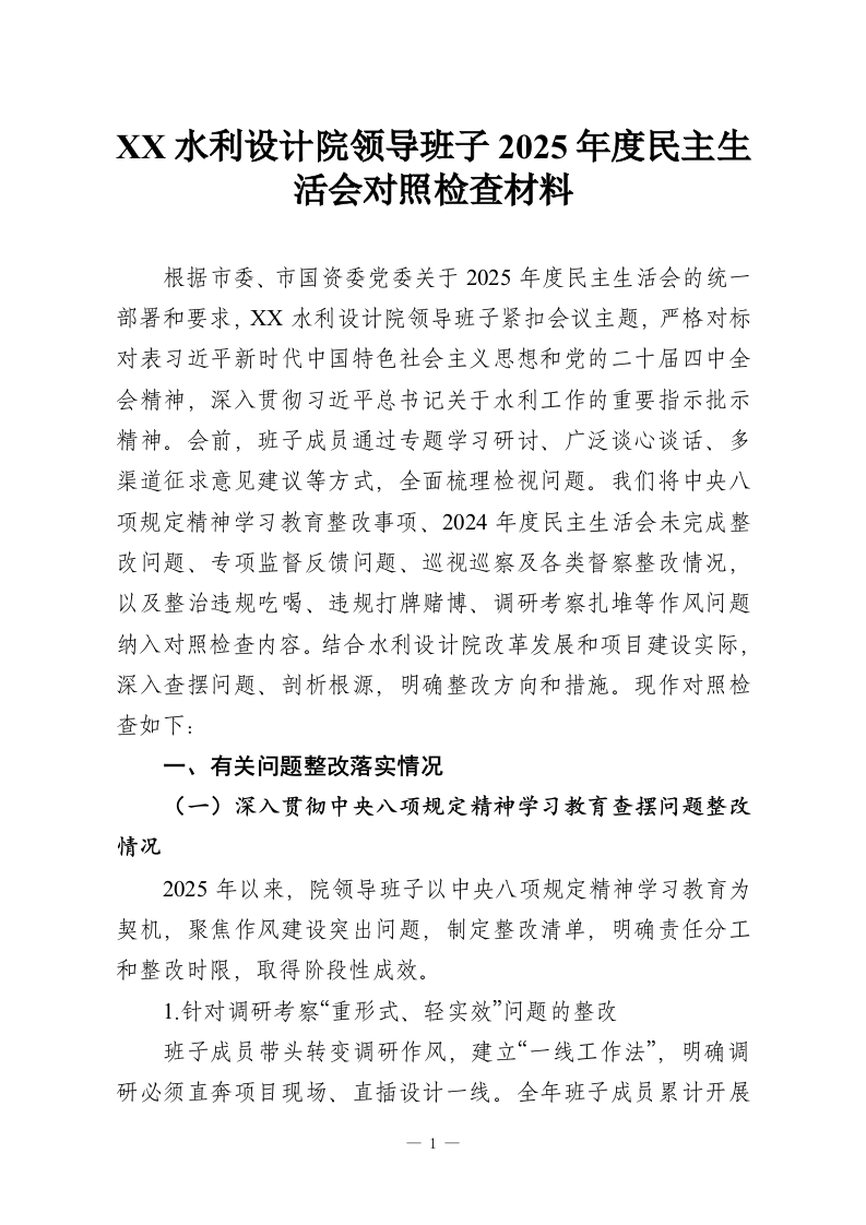 XX水利设计院领导班子2025年度民主生活会对照检查材料