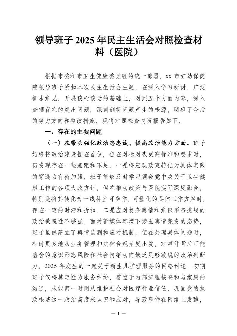 首页公文大全民主生活会领导班子2025年民主生活会对照检查材料(医院)