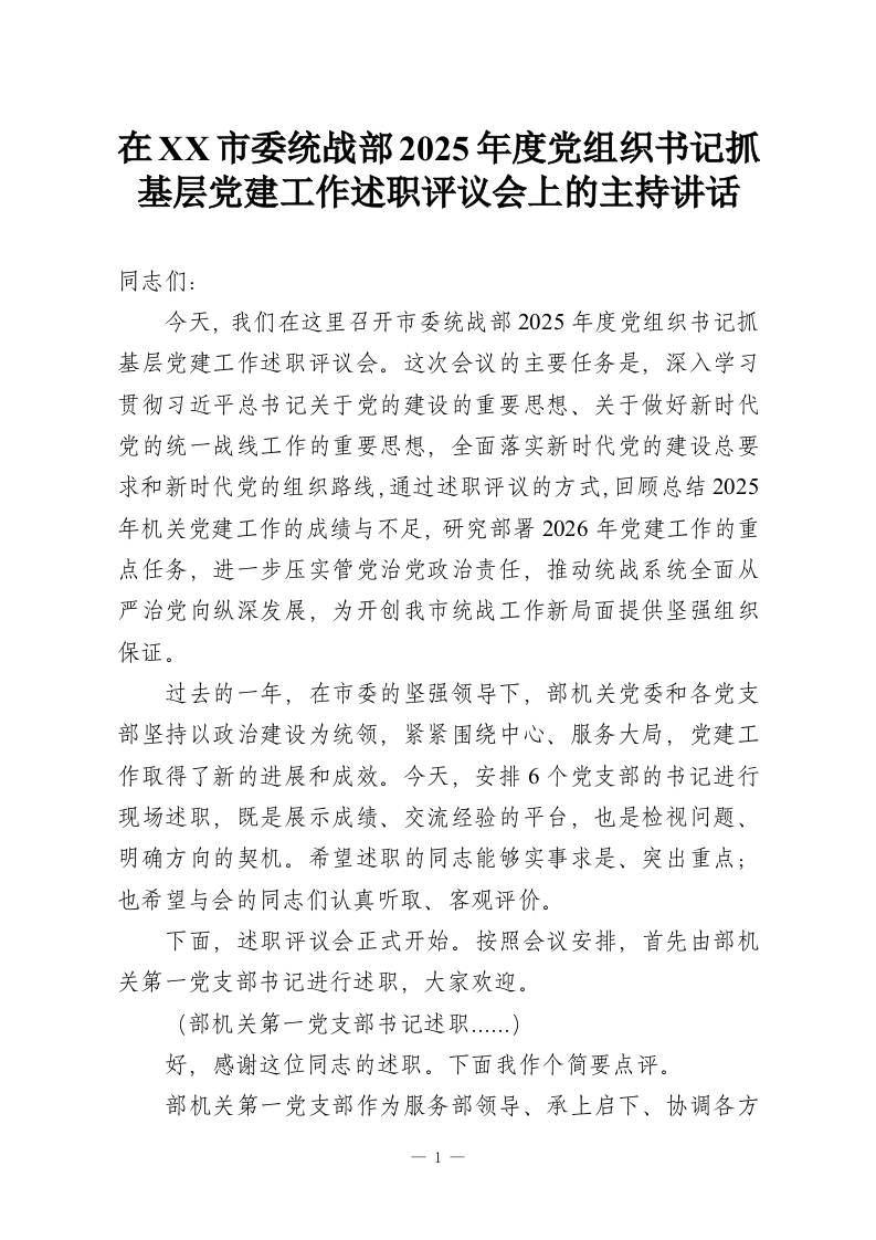 在XX市委统战部2025年度党组织书记抓基层党建工作述职评议会上的主持讲话