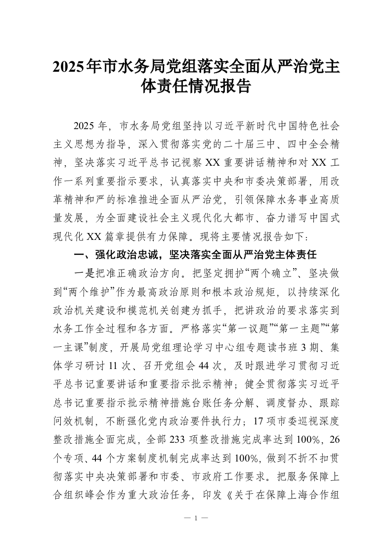 2025年市水务局党组落实全面从严治党主体责任情况报告