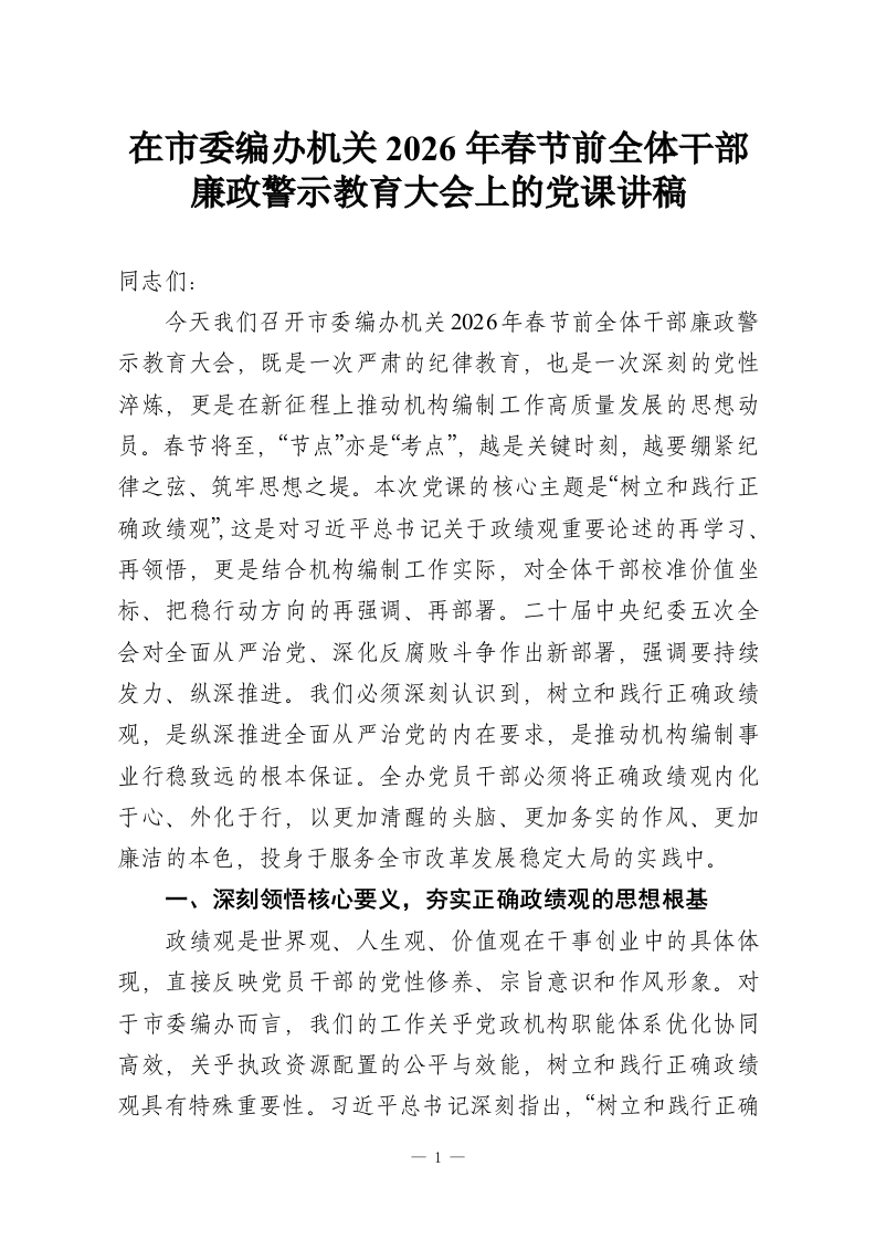 首页公文大全党课讲稿 在市委编办机关2026年春节前全体干部廉政警示教育大会上的党课讲稿