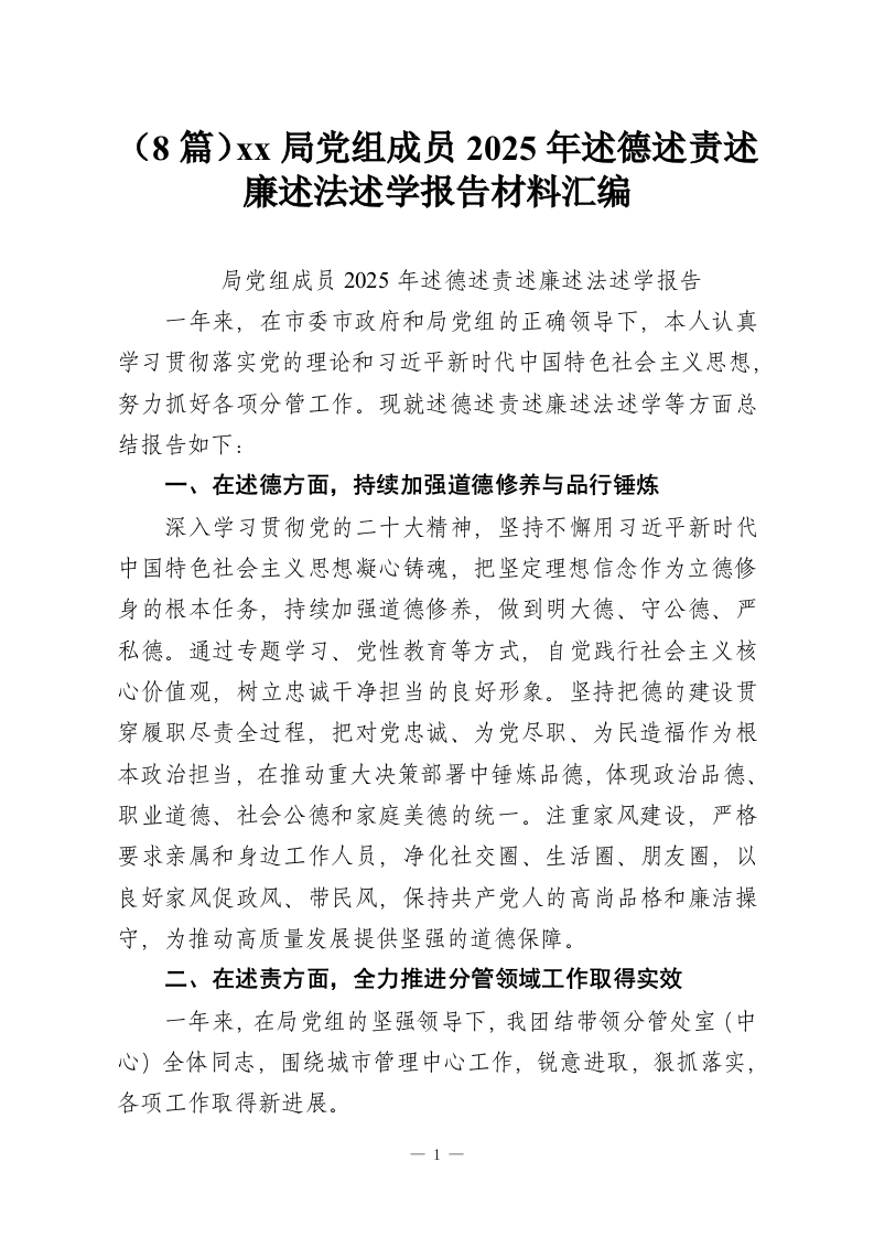 (8篇)xx局党组成员2025年述德述责述廉述法述学报告材料汇编