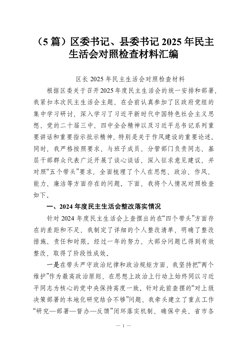 (5篇)区委书记、县委书记2025年民主生活会对照检查材料汇编