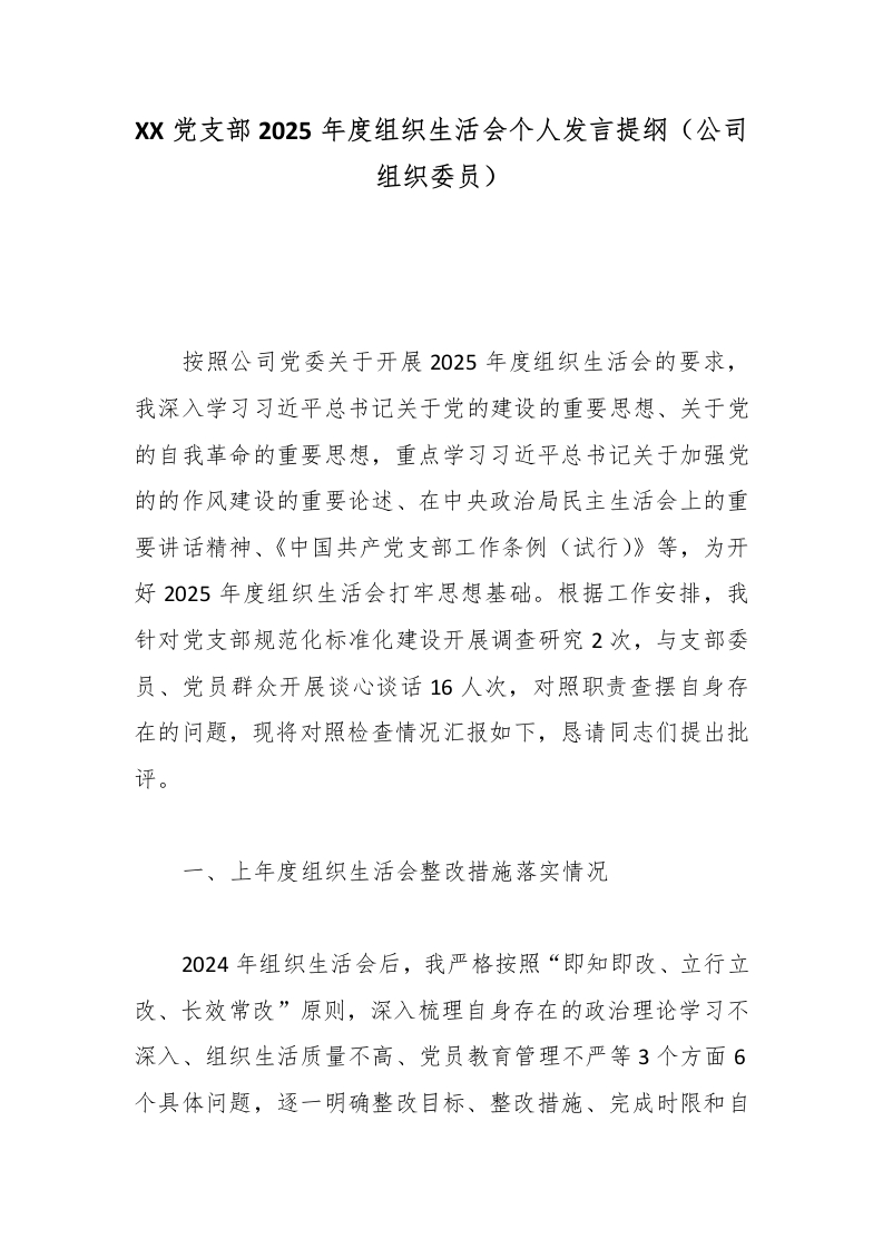 XX党支部2025年度组织生活会个人发言提纲(公司组织委员)
