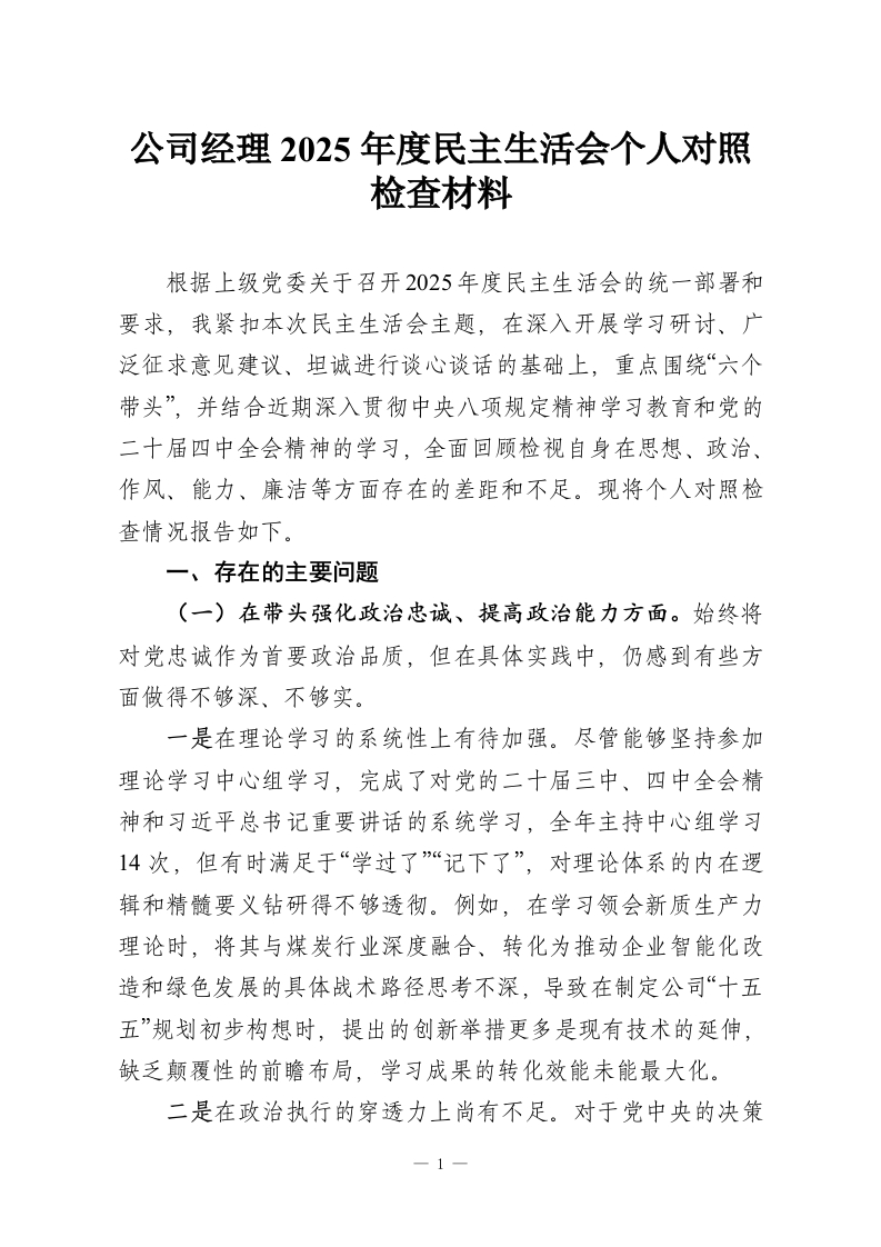 首页百家争鸣企业公司经理2025年度民主生活会个人对照检查材料