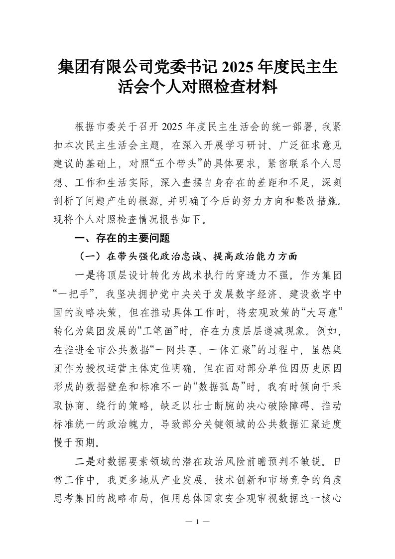 集团有限公司党委书记2025年度民主生活会个人对照检查材料