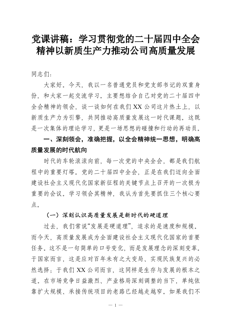 党课讲稿:学习贯彻党的二十届四中全会精神以新质生产力推动公司高质量发展