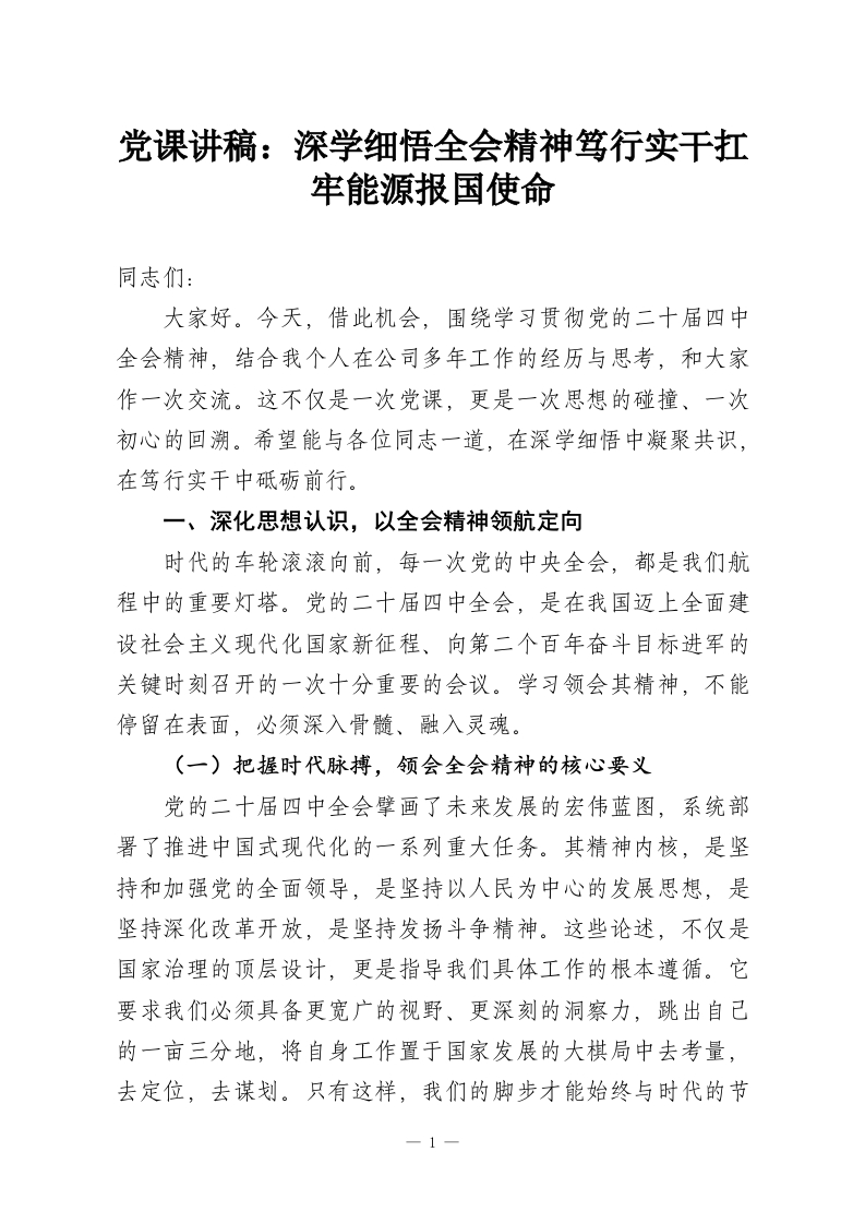 党课讲稿:深学细悟全会精神笃行实干扛牢能源报国使命