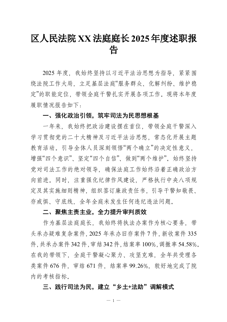 区人民法院XX法庭庭长2025年度述职报告