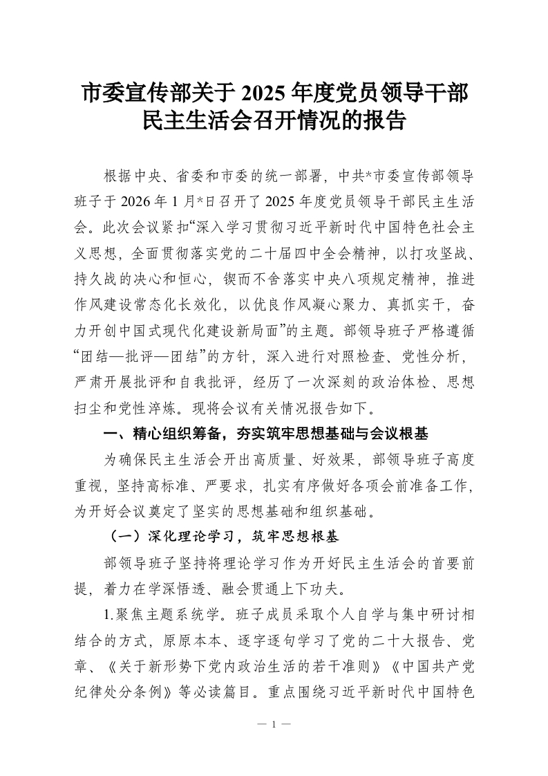 市委宣传部关于2025年度党员领导干部民主生活会召开情况的报告