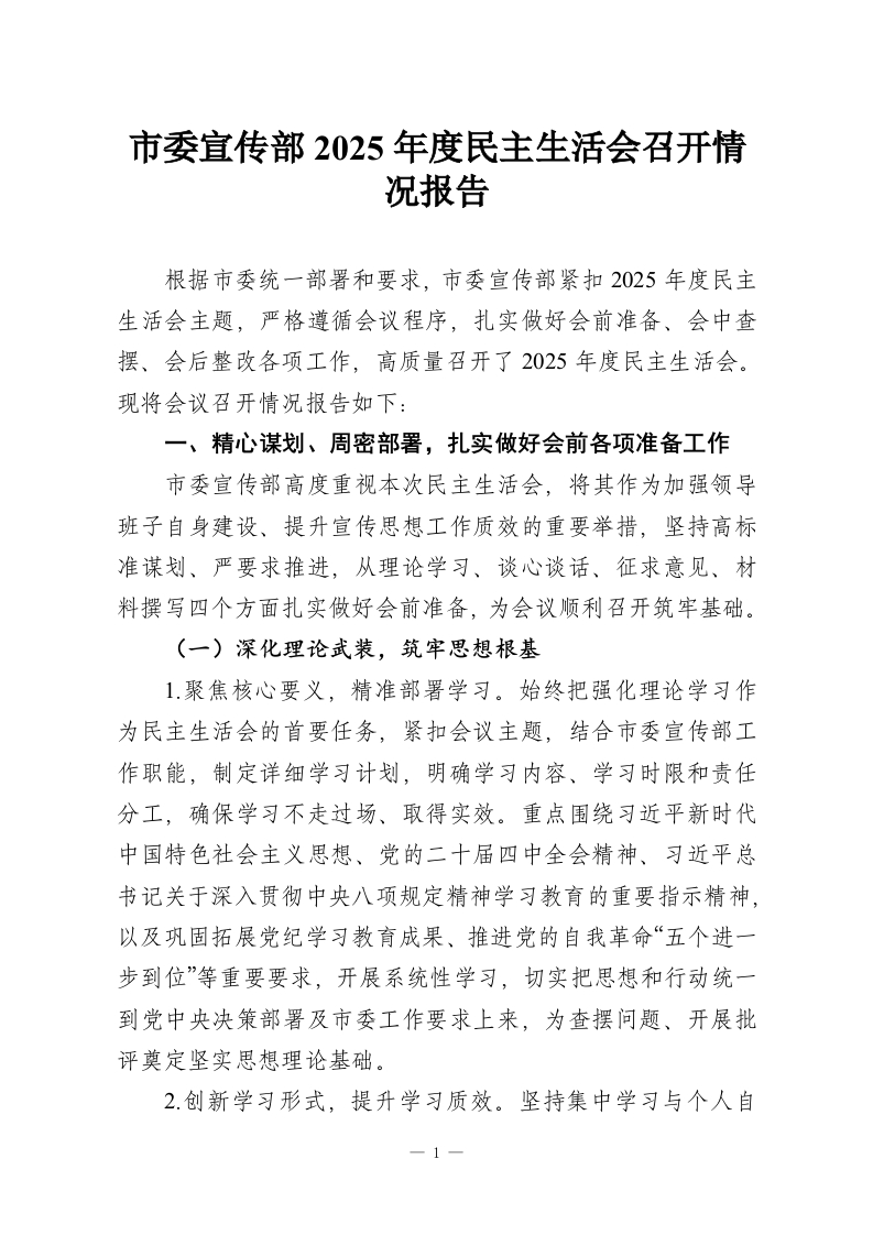 市委宣传部2025年度民主生活会召开情况报告
