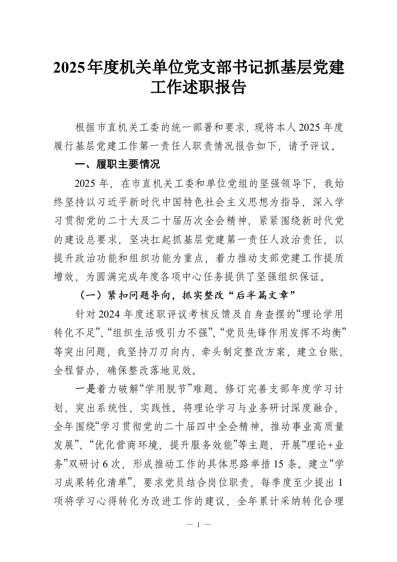 2025年度机关单位党支部书记抓基层党建工作述职报告