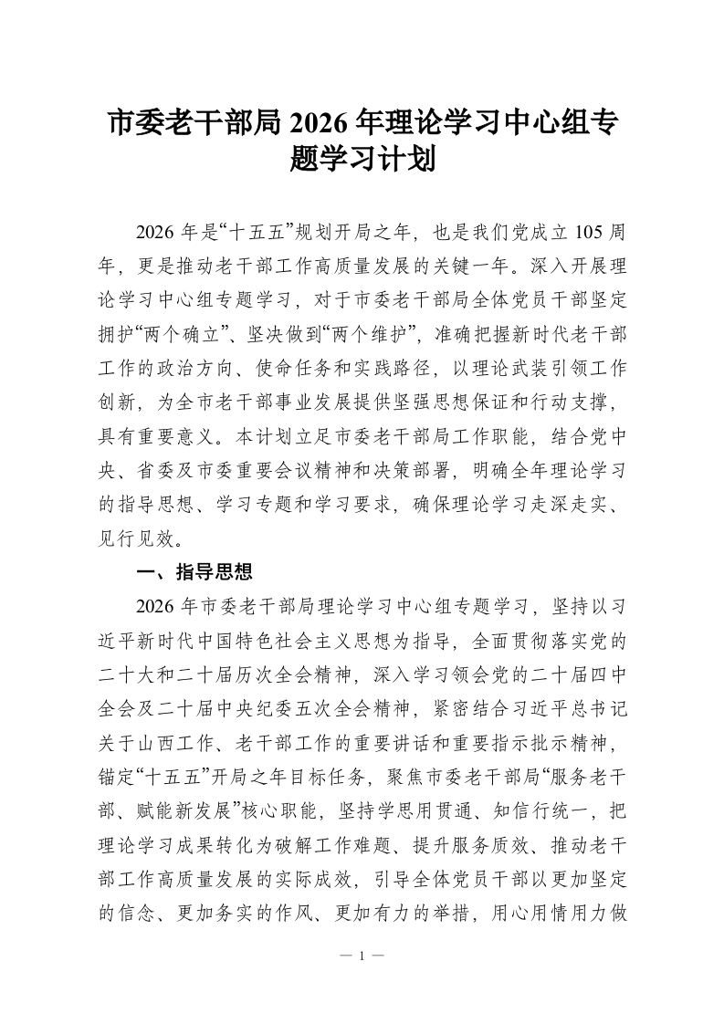 市委老干部局2026年理论学习中心组专题学习计划
