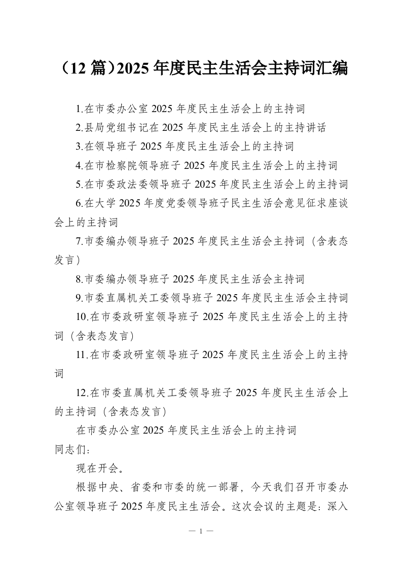 (12篇)2025年度民主生活会主持词汇编
