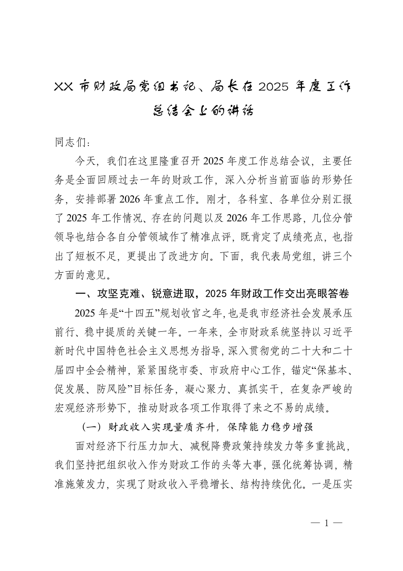 XX市财政局党组书记、局长在2025年度工作总结会上的讲话