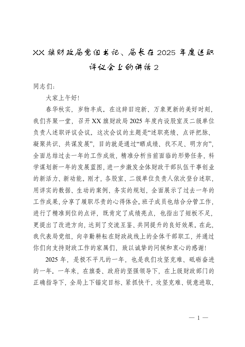 XX旗财政局党组书记、局长在2025年度述职评议会上的讲话2