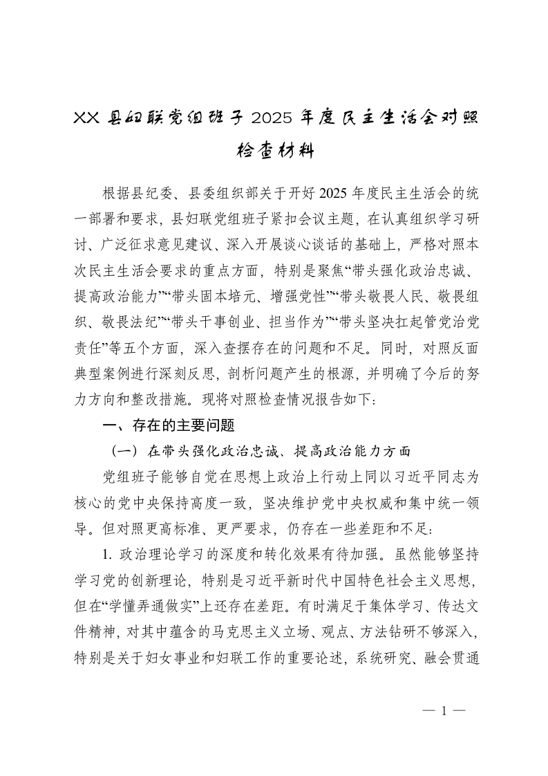XX县妇联党组班子2025年度民主生活会对照检查材料