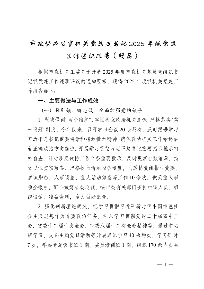 市政协办公室机关党总支书记2025年抓党建工作述职报告(精品)