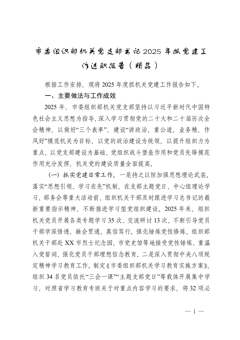 市委组织部机关党支部书记2025年抓党建工作述职报告(精品)